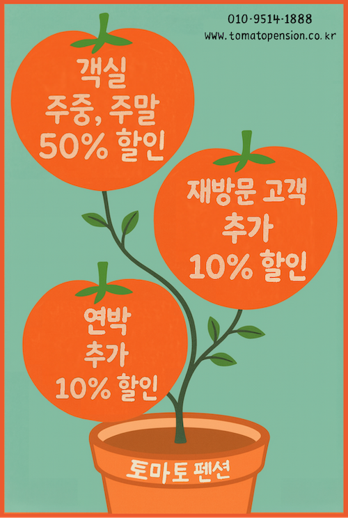 토마토 펜션에서 여러분의 더 즐거운 여행을 위해 가장 큰 혜택을 가지고 왔습니다!